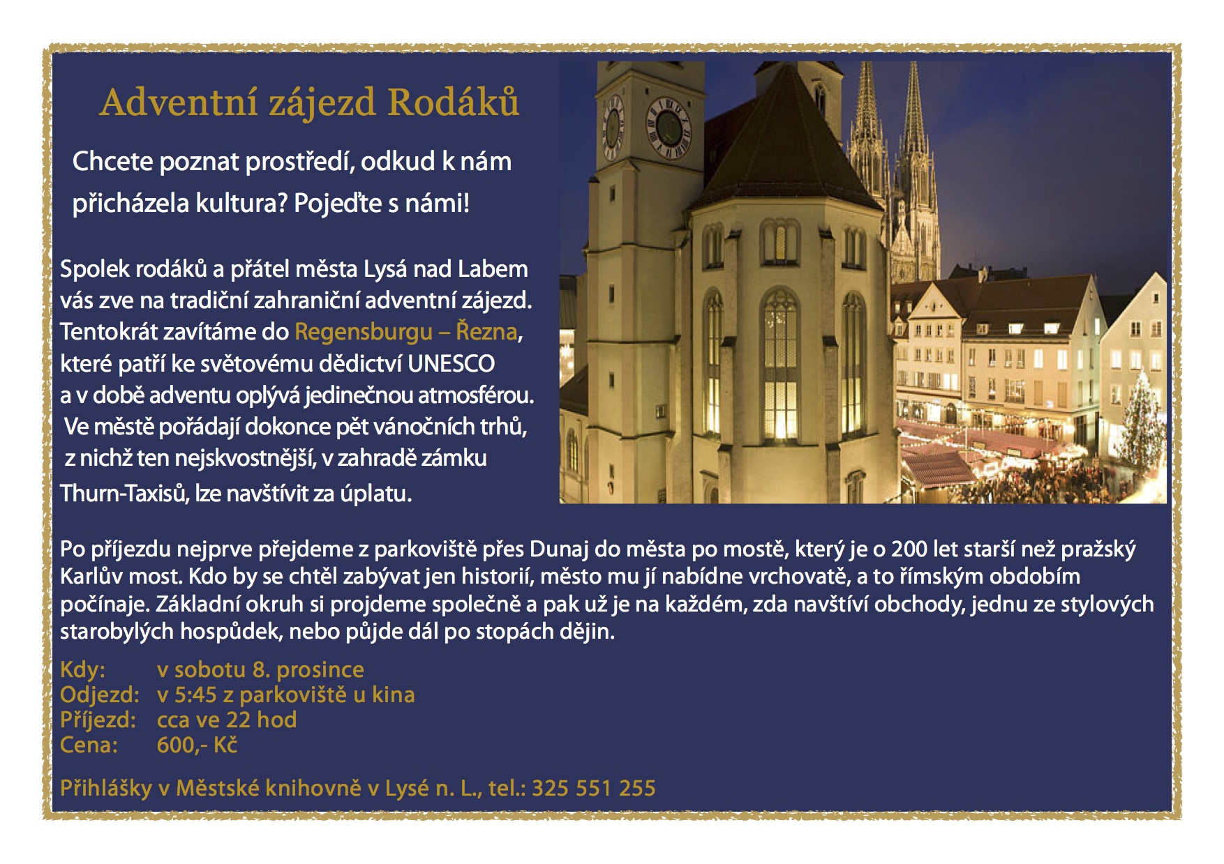 Adventní autobusový zájezd Akce proběhla 8. 12. 2018 od 5:45 Předvánoční zájezd Rodáků do Regensburgu.